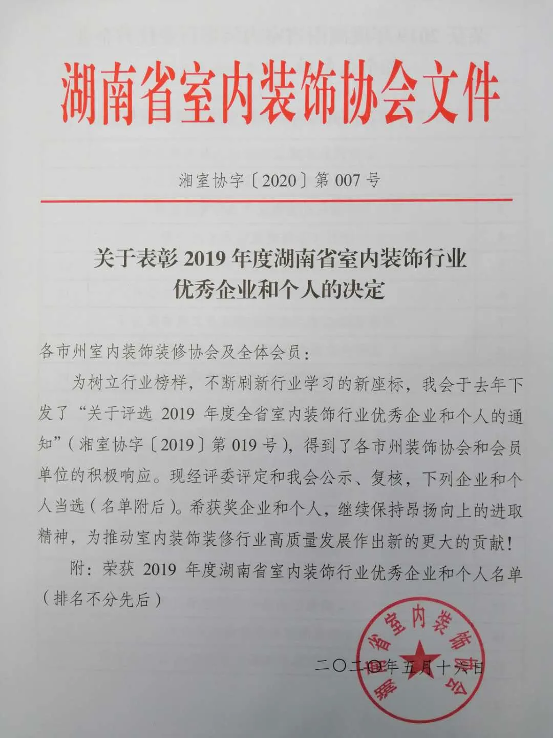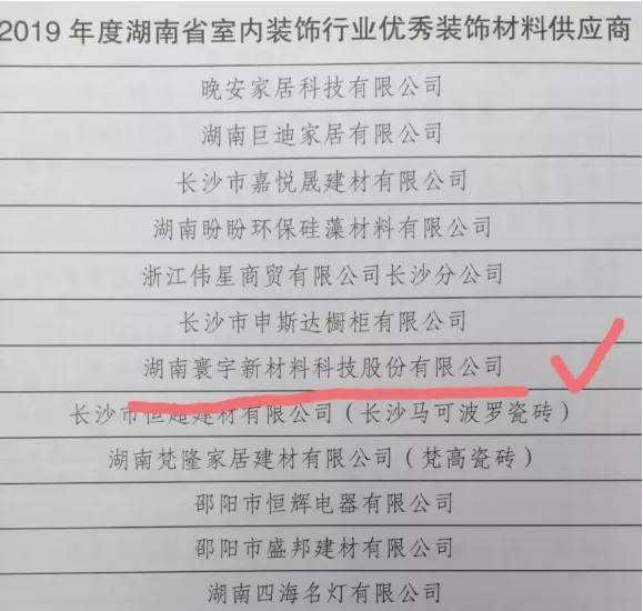 熱烈祝賀湖南寰宇新材料科技股份有限公司榮獲2019年度湖南省室內(nèi)裝飾行業(yè)優(yōu)秀裝飾材料供應(yīng)商!!
