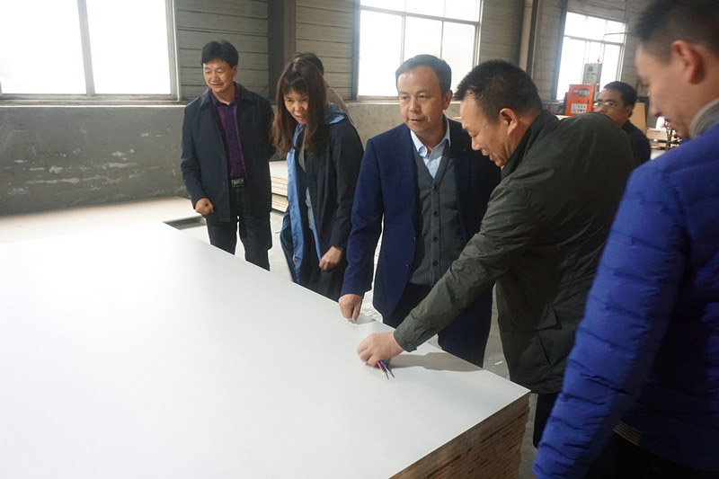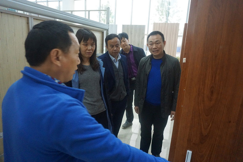 (周董事長在為省林業(yè)局產(chǎn)業(yè)辦副主任鄒艷靈、中方縣林業(yè)局局長王笑春講解寰宇板材)