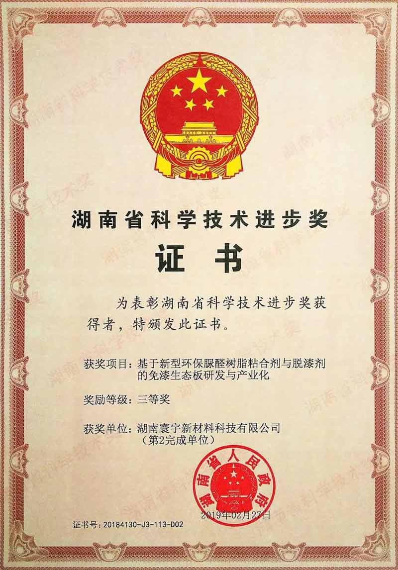 2018年度湖南省科學(xué)技術(shù)獎(jiǎng)評(píng)審結(jié)果公布,我公司(湖南寰宇新材料科技股份有限公司)和懷化學(xué)院強(qiáng)強(qiáng)聯(lián)手,通過校企合作研發(fā)“新型環(huán)保脲醛樹脂粘合劑”和“脫漆劑”面漆生態(tài)板產(chǎn)業(yè)化項(xiàng)目,改進(jìn)了免漆板生產(chǎn)工藝,降低了生產(chǎn)成本,甲醛釋放量達(dá)到了國際先進(jìn)的E0級(jí)標(biāo)準(zhǔn)。解決了板材生產(chǎn)用脲醛樹脂膠毒性大、粘合力低、儲(chǔ)存期短、穩(wěn)定性差等問題。“脲醛樹脂膠”和“脫漆劑”還解決了面漆生態(tài)板產(chǎn)業(yè)化關(guān)鍵問題。我公司該項(xiàng)目執(zhí)行三年來累積新增產(chǎn)值2億多元。