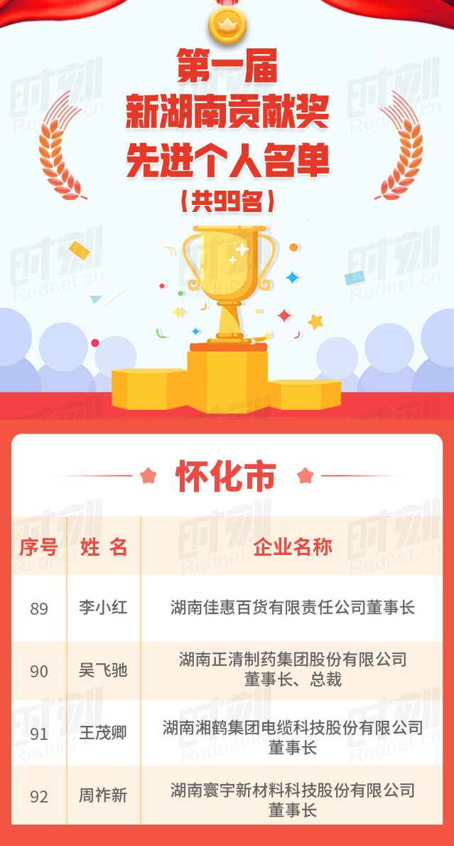 2021年12月28日,由湖南省人民政府舉行第一屆“新湖南貢獻獎”和“2021三湘民營企業(yè)百強榜”獲獎名單出爐,在會上,副省長何報翔發(fā)布《中共湖南省委湖南省人民政府關于表彰第一屆新湖南貢獻獎先進集體和先進個人的決定》,而湖南寰宇新材料科技股份有限公司的董事長周祚新,就是全省新湖南貢獻獎先進個人名單中的其中一員。