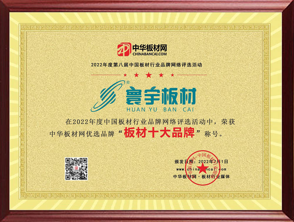 助力板材企業(yè)品牌成長,打造板材行業(yè)品牌標(biāo)桿。中華板材網(wǎng)初心如磐,同心同路同行。2022年7月1日,第八屆2022年度中國板材行業(yè)品牌網(wǎng)絡(luò)評選活動(dòng)圓滿收官,各項(xiàng)排行榜重磅發(fā)布!祝賀寰宇板材榮獲2022年度中華板材網(wǎng)優(yōu)選榜“板材十大品牌”稱號。